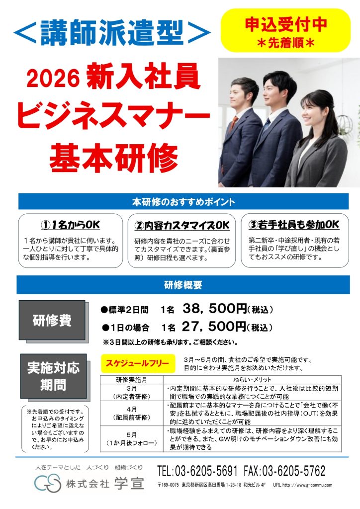 1名から講師が伺います! 新入社員だけでなく、第2新卒の方や中途採用の方もOKです。 ビジネスマナーの学び直しを含めて幅広く対応します。 お気軽にお問い合わせください。(詳細および申し込みは画像をクリックしてご覧ください)<講師派遣型> 2026新入社員ビジネスマナー基本研修 申込受付中